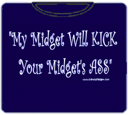 ![]() MY MIDGET WILL KICK YOUR MIDGETS ASS T-Shirt $14.99 |