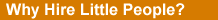 Disclaimer - Little people are first and foremost human beings, it is secondary that they are human beings who are of restricted growth. The use of the word "little person" on this website to describe someone of short stature may be considered offensive by some people, but we do not promote the discrimination of little people. This website is merely a way to provide Little People with employment opportunities. It should be noted that the founder of this website is a member of Little People of America, Inc. (LPA).